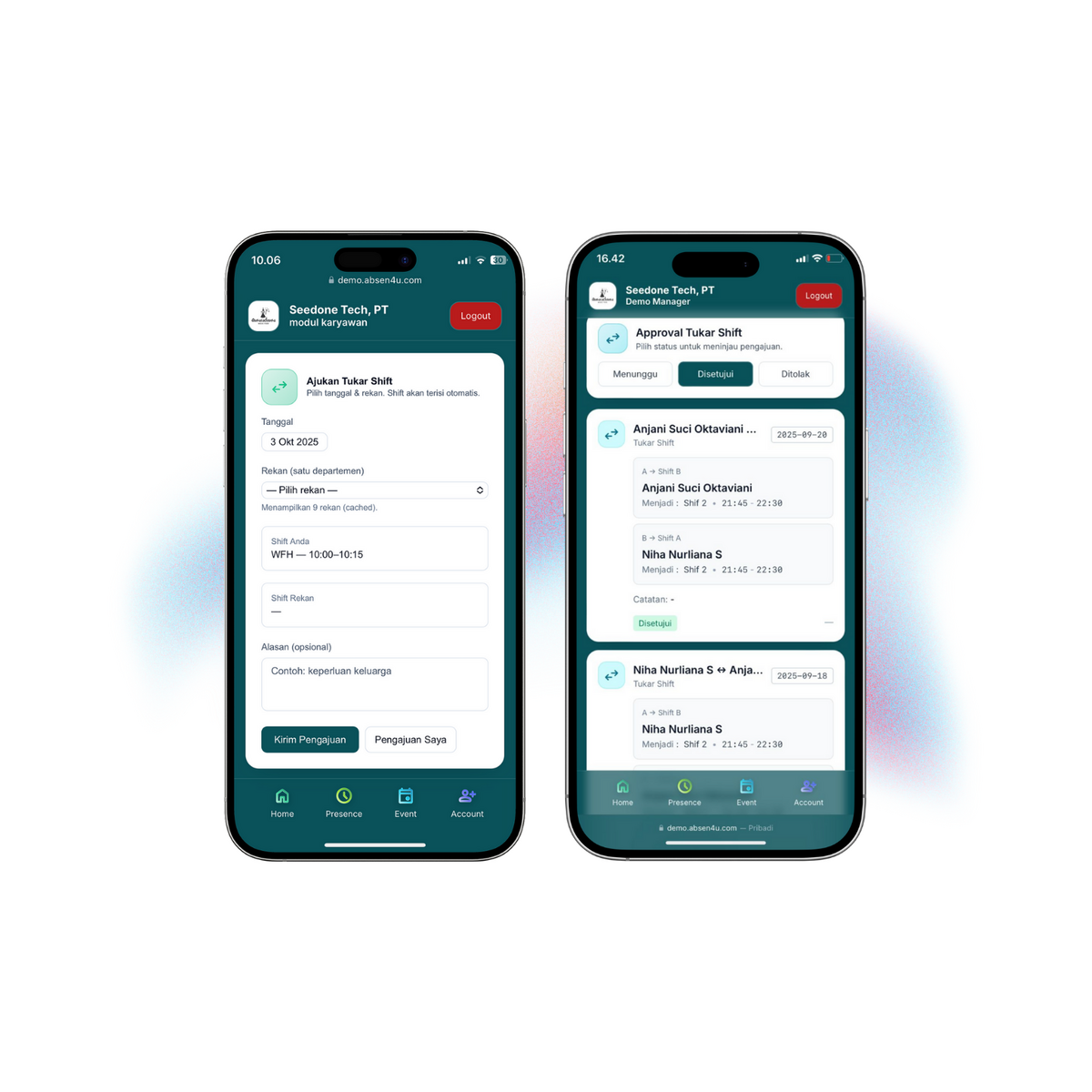 Fitur ini juga memungkinkan karyawan melihat jadwal kerja dan mengajukan tukar shift dengan rekan kerja melalui sistem yang terkontrol dan transparan. Dengan begitu, perusahaan dapat mengurangi risiko kesalahan jadwal, meningkatkan koordinasi, serta memastikan operasional berjalan lebih lancar dan produktif.
